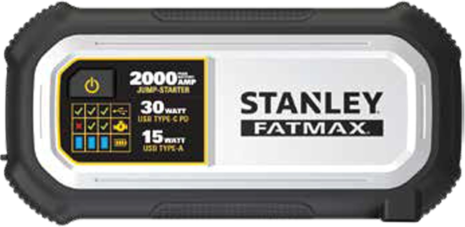 STANLEY FatMax LJ20F 2000 Peak Amp Lithium Jump Starter, 30 Watt USB Type-C PD, 15 Watt USB Type-A: Smart Controller and Battery Clips