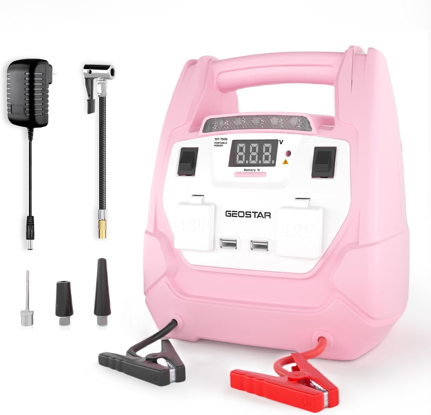GEOSTAR 4-in-1 Pink Jump Starter with Air Compressor 150PSI, 750A Portable Battery for 8.0L and 6.0L Engines, with Smart Jumper Cable, 2 USB Ports, 2 DC Ports, LED Light, Gifts for Women, Mom, Wife