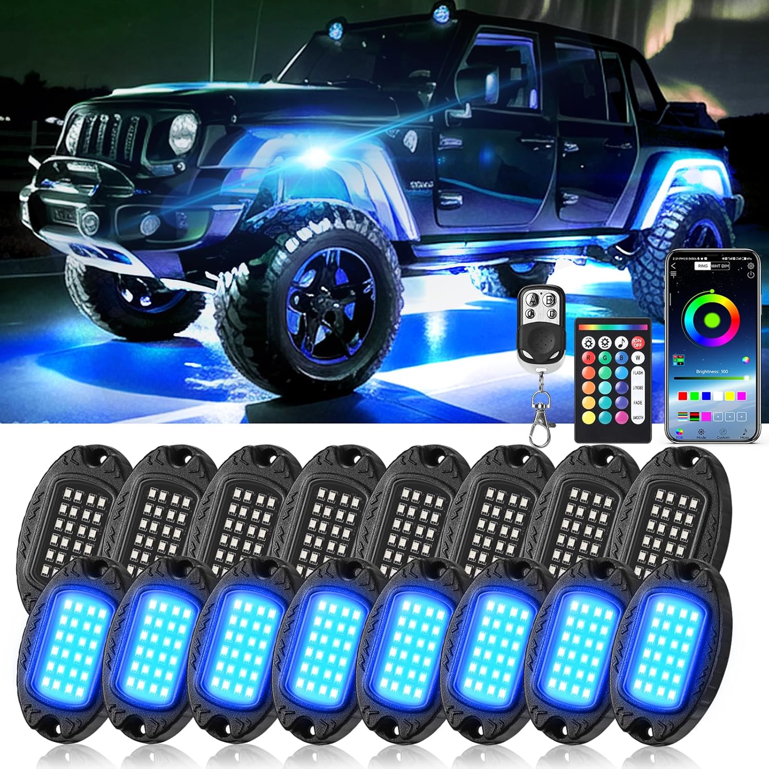 16Pods Metal Alloy RGB LED Rock Lights with APP/Dual RF Remote Control, 384LEDs Underbody Light Dual Zone Multicolor Underglow Lights Kit Neon Light for Jeep Trucks ATV Golf carts Off-Road Vehicles