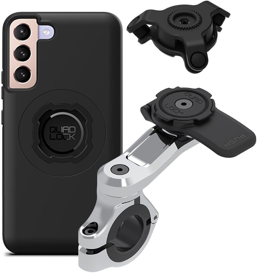 Quad Lock Motorcycle Handlebar Phone Mount PRO Chrome with Vibration Dampener and MAG Phone Case for Galaxy S22+
