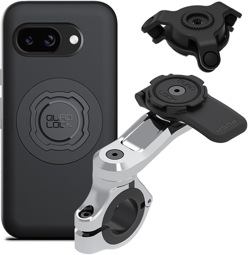 Quad Lock Motorcycle Handlebar Phone Mount PRO Chrome with Vibration Dampener and MAG Phone Case for Google Pixel 9a
