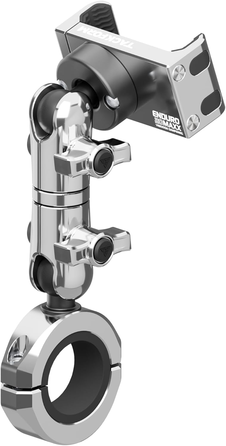 Tackform Chrome Motorcycle All Metal Phone Mount - Vibration Dampening 20MAXX Spring Cradle | 3.5" Long Reach Arm | Universal Clamp Fits 1-1/4" to 1-1/2" Bars | Compatible with iPhones, Galaxy, More