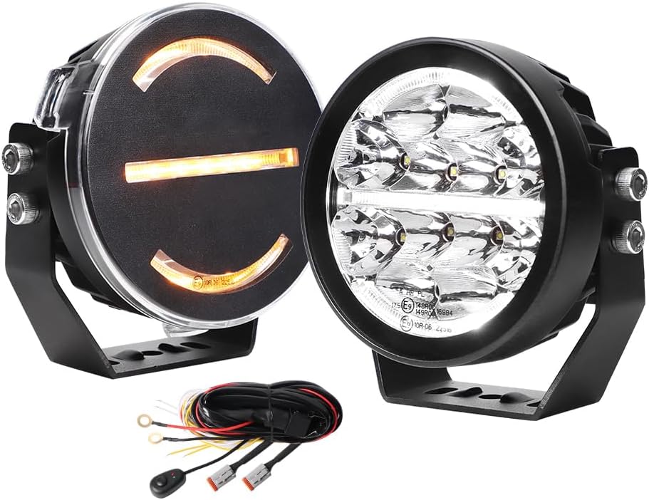 EXZEIT 5 Inch Offroad lights with Yellow DRL, 120W Round Driving Light with DT plug wiring kit, Protective overs, 5'' Front Bumper Light for Pickup UTV ATV Truck, 12V/24V