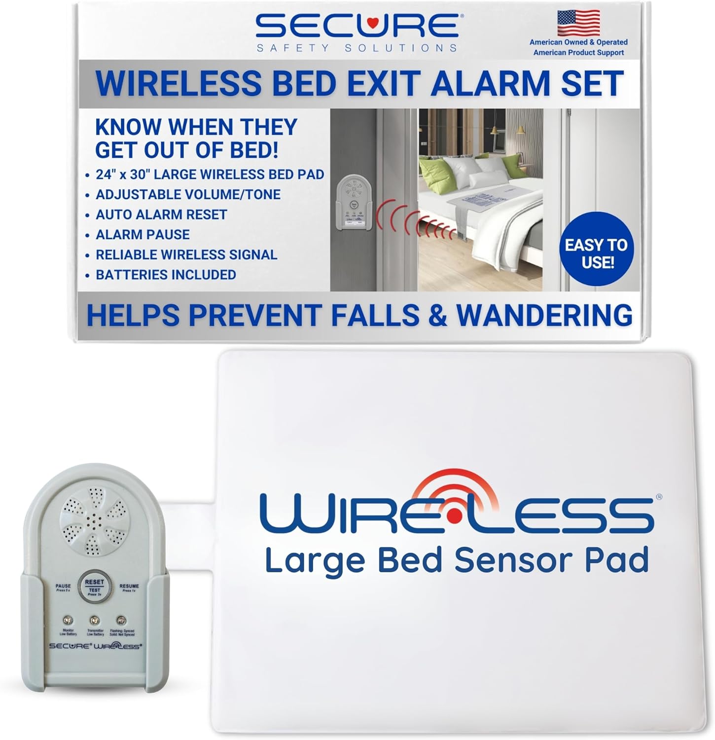 Secure Wireless Bed Alarm for Elderly Adults - Large 24"x30" Sensor Pad & Monitor - Safety Bed Alarms and Fall Prevention for Dementia Patients - Caregiver Alert System