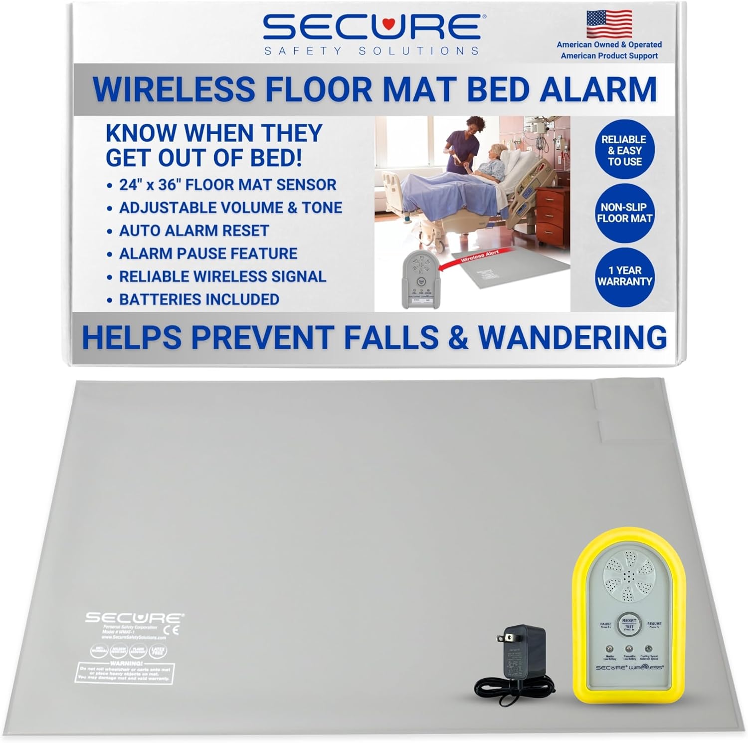 Secure Wireless Floor Mat Bed Alarm for Seniors - Wireless Alarm Monitor, Floor Mat Sensor, Transmitter, Power Adapter - No Noise in Patient Room - Fall &Wandering Prevention for Elderly Dementia