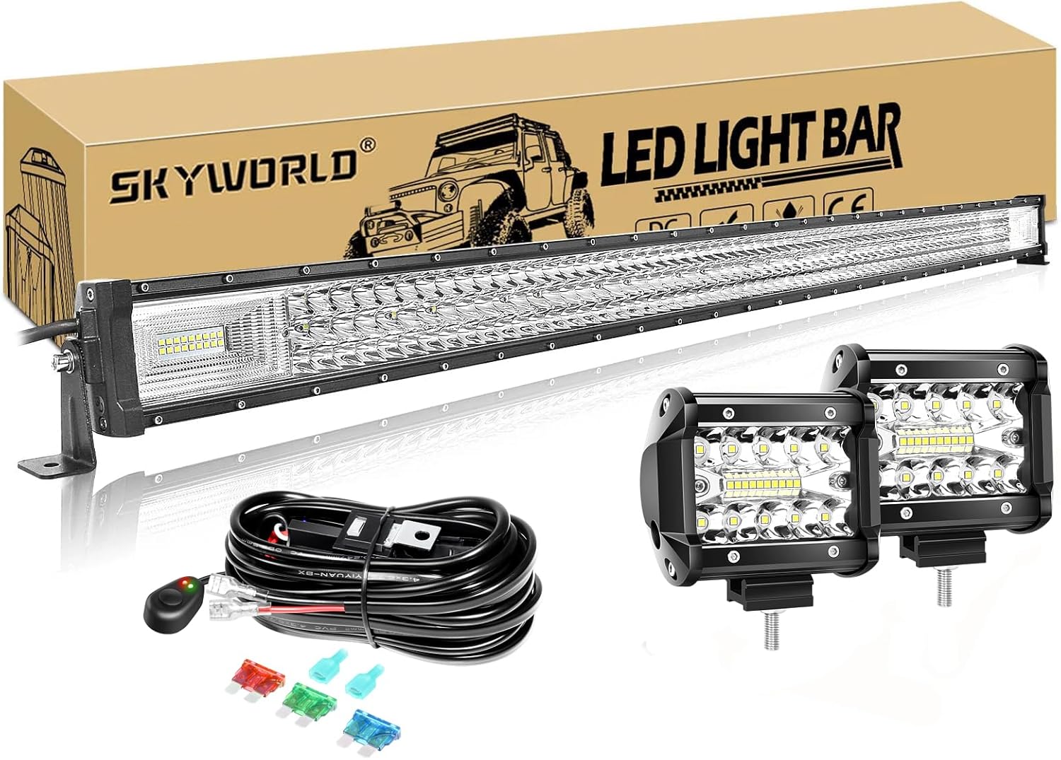 SKYWORLD 52 Inch Straight 675W Tri-Row LED Light Bar + 2PCS 4 Inch 60W Spot LED Pods - Spot/Flood Combo Beam, Off-Road Work Lighting for Trucks UTV ATV Boat,Included Wiring Harness