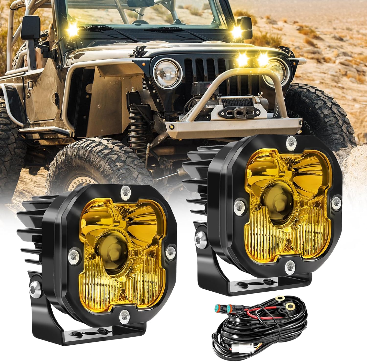 3 inch Yellow LED Fog Light Pods for Offroad Trucks Pickup Motorcycle UTV Amber Ditch/Rear Chasing/A-Pillar Lights 3000K 2PCS(+DT Wiring Harness)