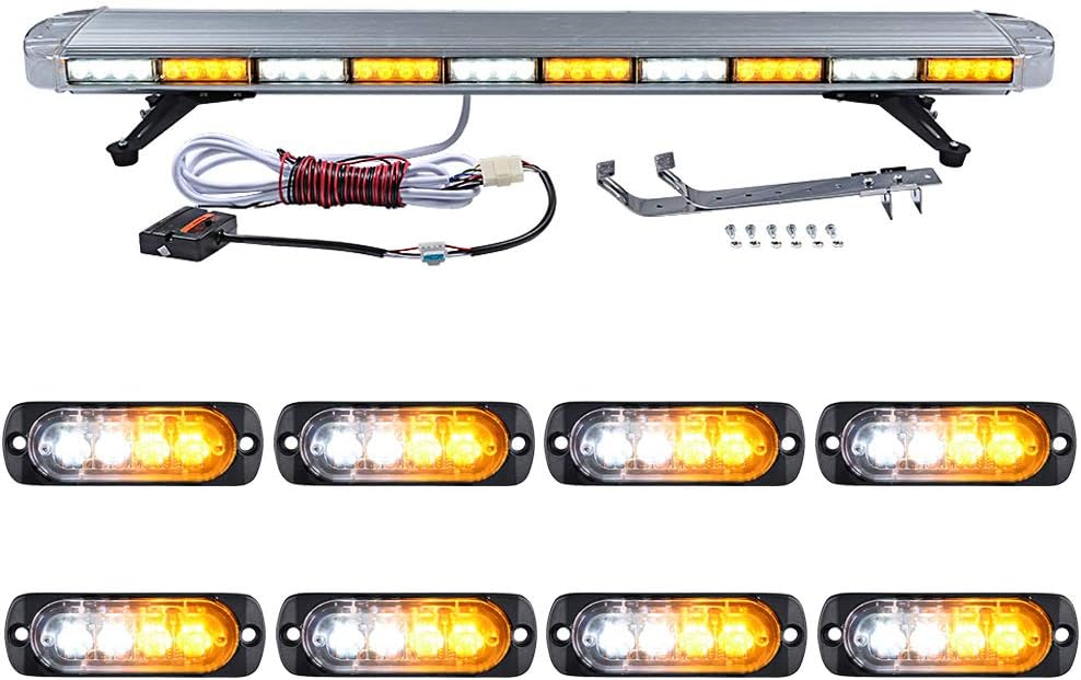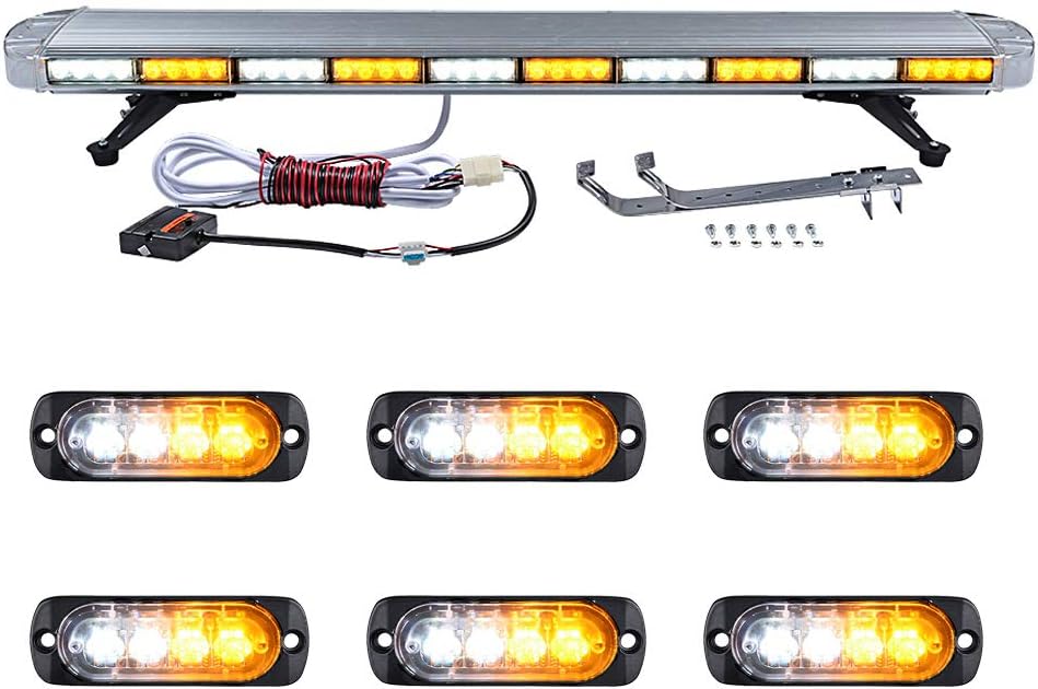 1PC 47" 88 LEDs Emergency Strobe Light Bar & 6PCS 4-LED Flashing Grille Light Kit for Construction Vehicle Truck Trailer RV Accent & Off Road Lighting (Amber White)