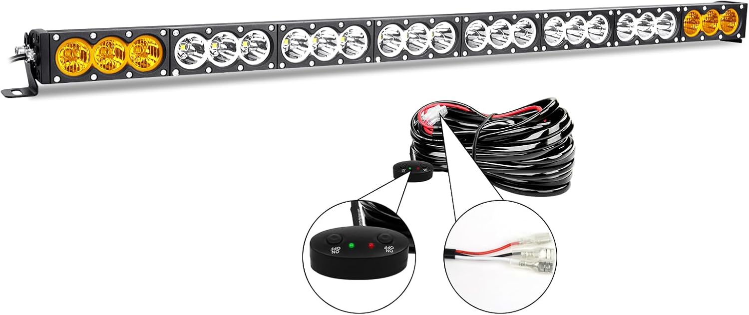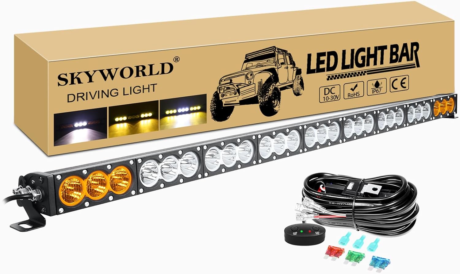 SKYWORLD Single Row LED Light Bar with 12V Wiring Harness Kit, 49 inch 270W Dual Color White Amber Offroad Driving Fog Lights Roof Bumper LED Bar for Car Truck SUV UTE ATV 4x4 4WD Vehicles