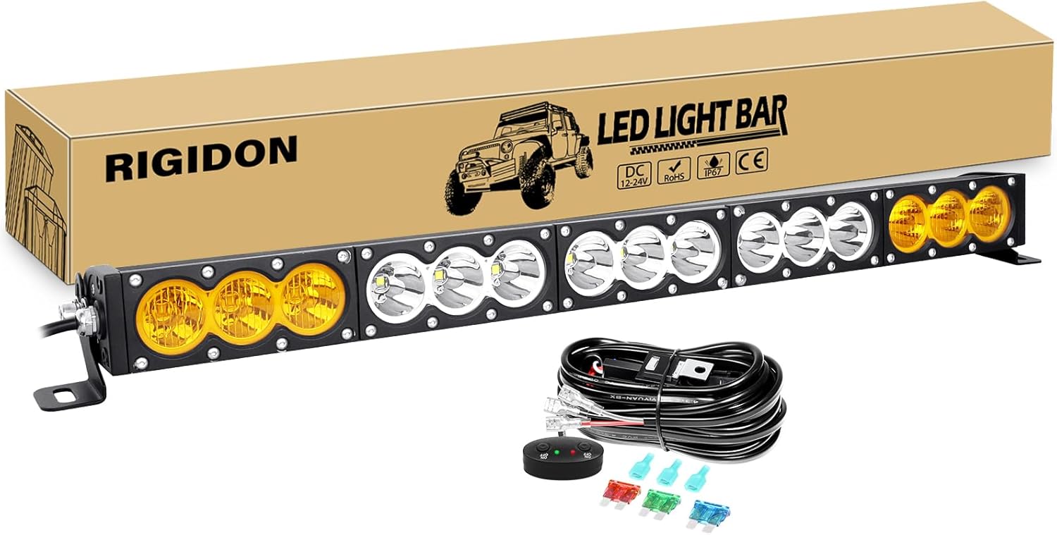 RIGIDON 28 Inch 150W Single Row LED Light Bar with Wire Harness, White Amber Spot Flood Combo 15000LM Off-road Light Driving Boat LED Fog Work Light for Trucks ATVs UTVs SUVs Car
