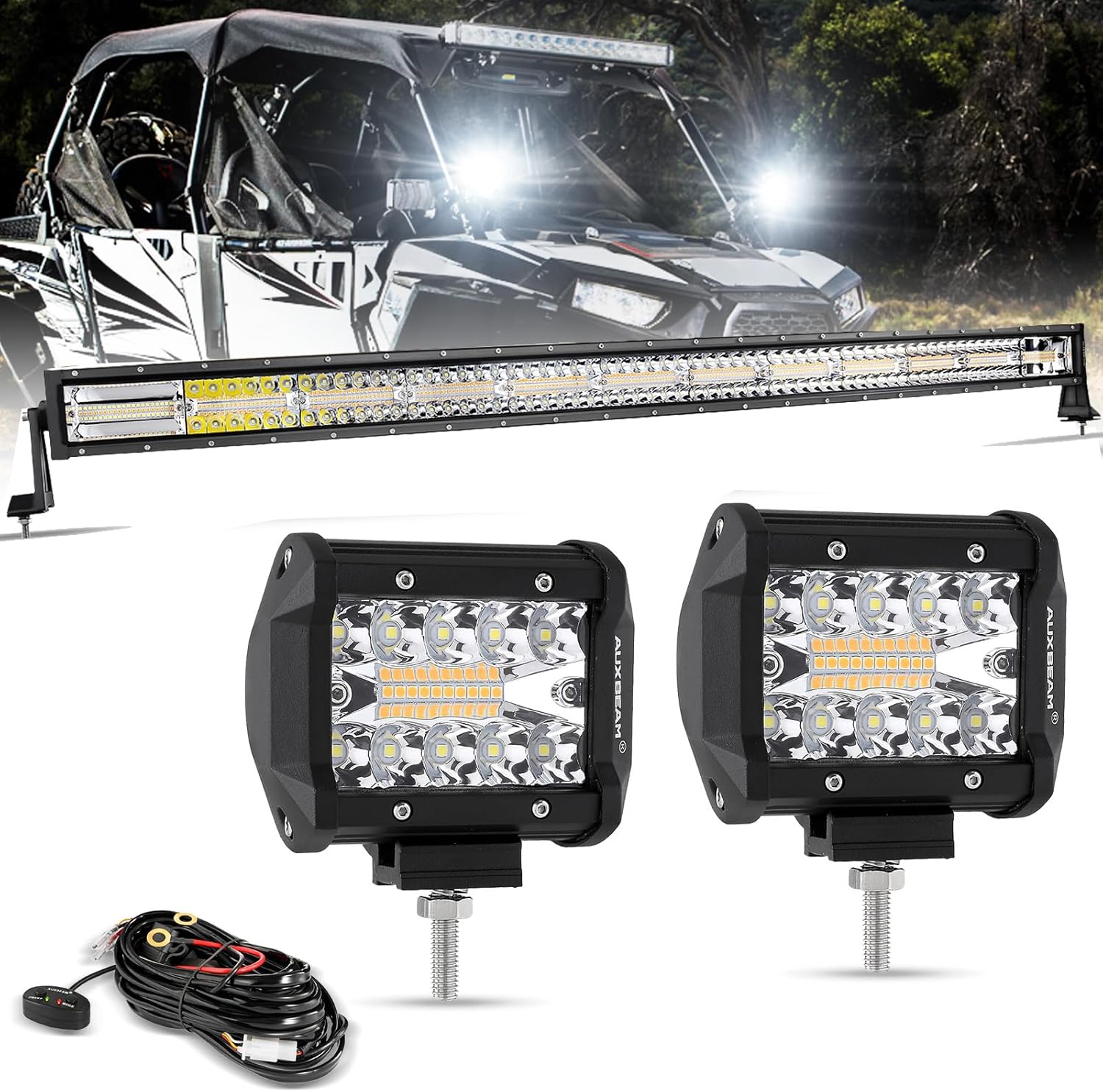 Auxbeam 4 Inch + 50 Inch LED Pods, 6 Modes Spot Flood Combo Beam Driving Fog Light with Wiring Harness Kit for Car Jeep Off Road SUV UTV ATV