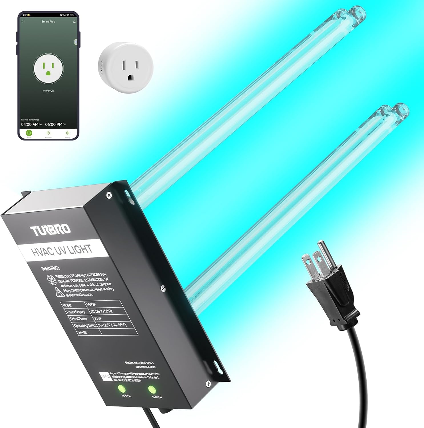 TURBRO 72W UV Sanitizer Lamp with Smart Plug, ETL&CARB Listed, Ozone Free Ultraviolet Light with Timer Outlet, Air Purifier for HVAC Units and Ducted Systems, WiFi Control, Direct Plug-In 120V, UV72PW