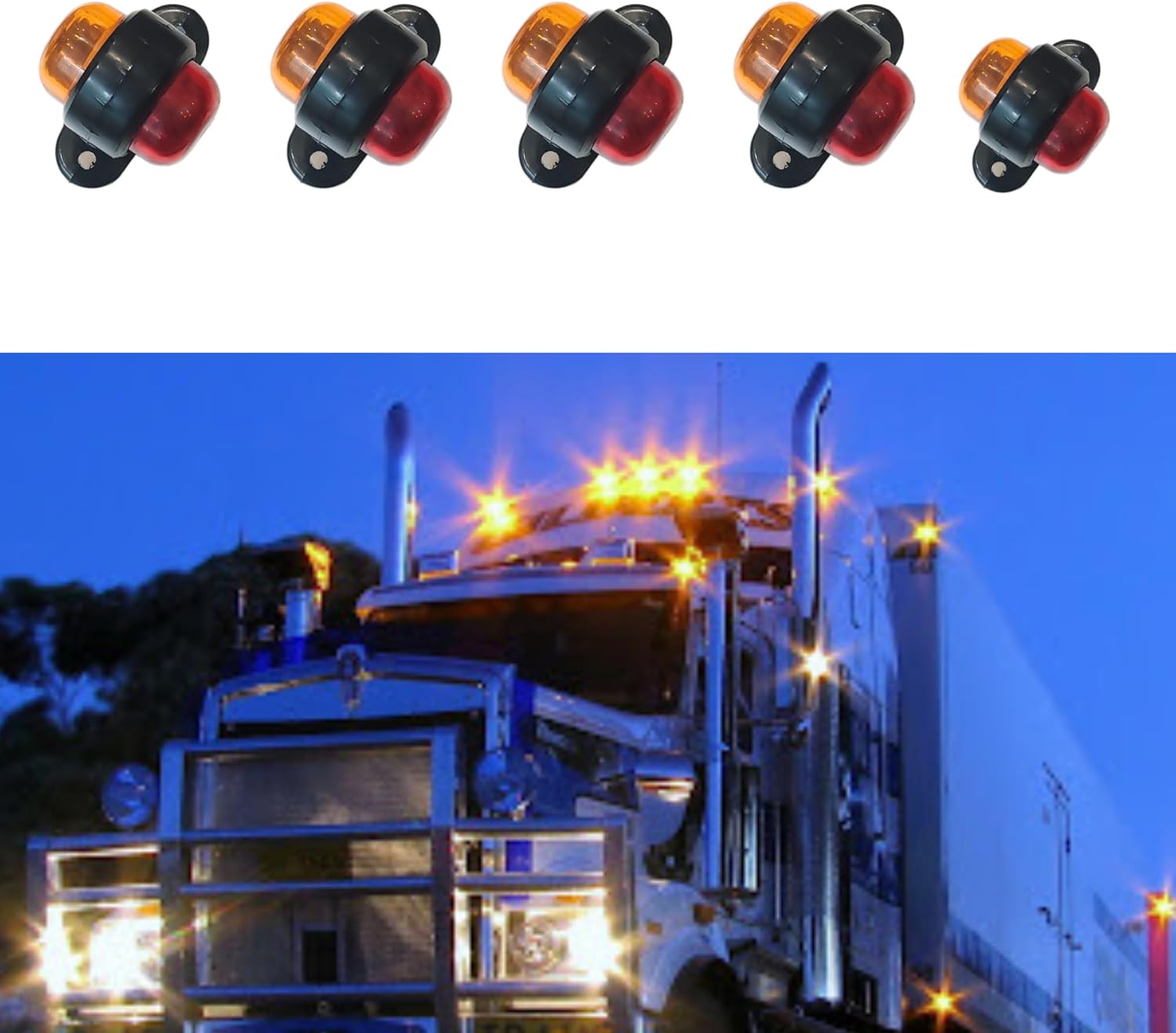 5pcs Red/Amber 12V Cab Light LED Top Roof Running Marker Lights Black Base Compatible with Peterbilt,Kenworth,Freightliner,Western Star,Mack,International Trailer Trucks