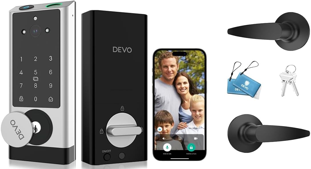DEVO G1 Video Smart Lock with Camera & Doorbell, 6-in-1 Keyless Entry Door Lock for Front Door with Fingerprint, Auto Locks, App Remote, Wi-Fi Smart Deadbolt Silver with Handle