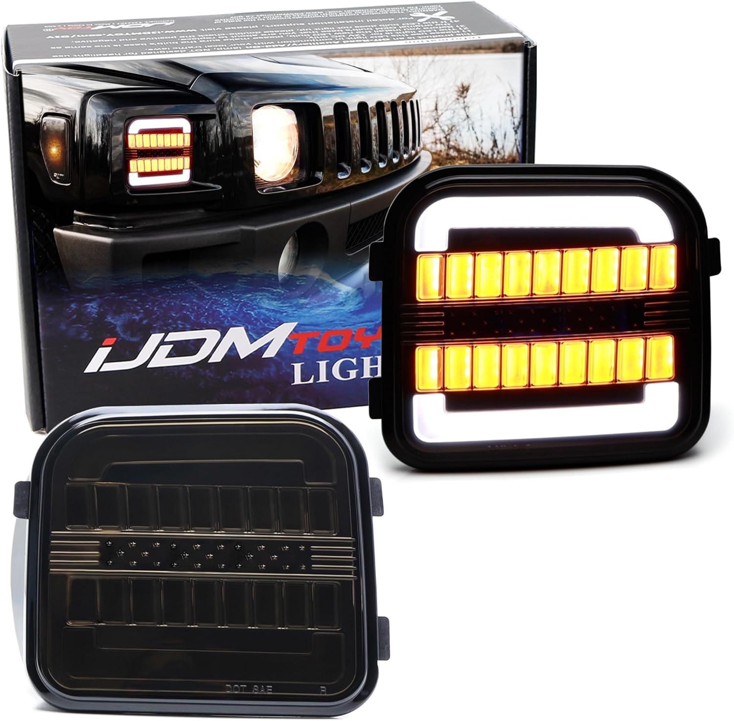 iJDMTOY Blackout Smoked Lens White LED Halo Driving Light/Amber Sequential Blink LED Front Turn Signal Light Assembly, Compatible with 2006-2010 Hummer H3/H3T