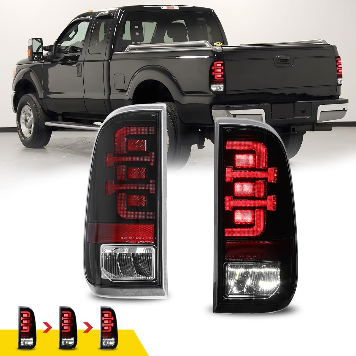 ROXX Full LED Tail Lights for 2008-2016 Ford F-250/F-350/F-450 Super Duty, Light Bar Design LED Lamps Tail Light Brake Parking Lamps Left+Right with Sequential Turn Signal Black Housing Clear Lens