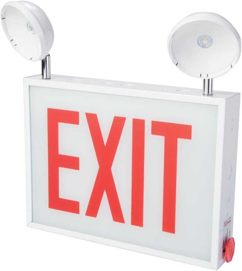 Sure-Lites LED Exit Sign with Emergency Lights, Two Adjustable LED Light Heads, White Steel and Glass Lens with Red Letters, Single Side, Battery Backup, 120-277V, Meets City of Chicago Fire Code