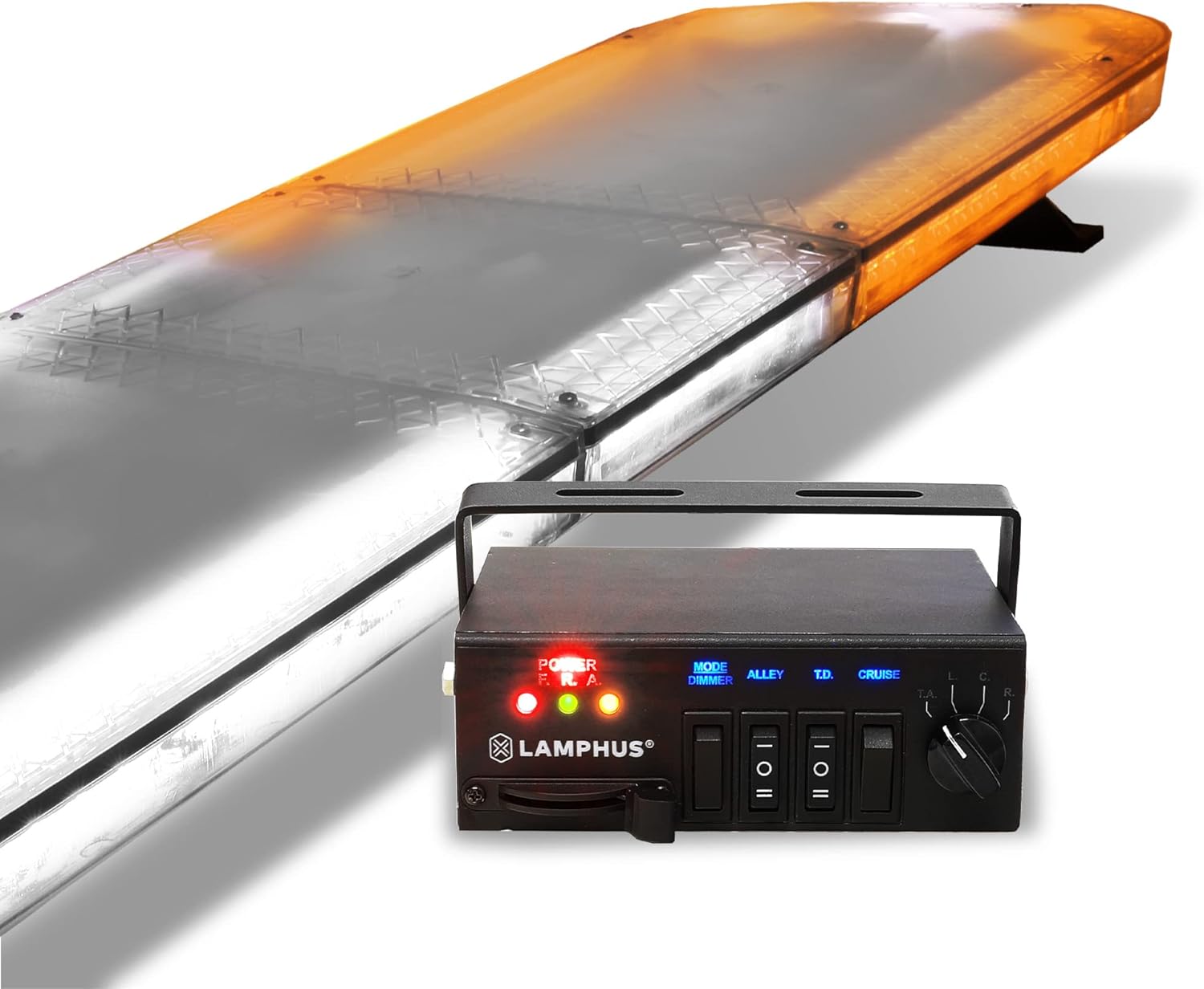 LAMPHUS SolarBlast SBFB98 47" 98W Amber White LED Emergency Full-Size Light Bar [SAE J595 Class III] [58 Flash Mode] [Controller Box] [Gutter Bracket] Yellow Flashing Rooftop Strobe Warning Light Bar