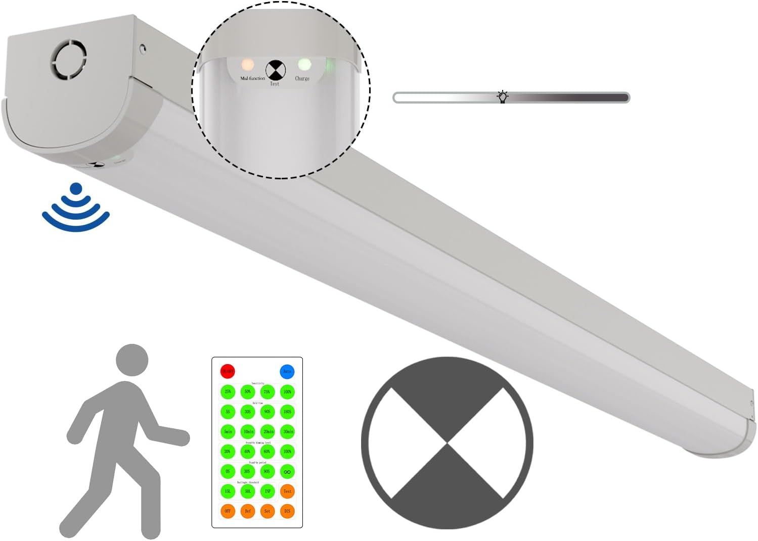 2FT Tri-Level Motion Sensor LED Linear Strip Emergency Stairwell Light w/Remote, 10W/20W 1250lm/2500lm, Battery Backup, 5000K, 100-277V IP20, Dimmable 2 Foot Commercial Shop Ceiling Light Fixture, ETL