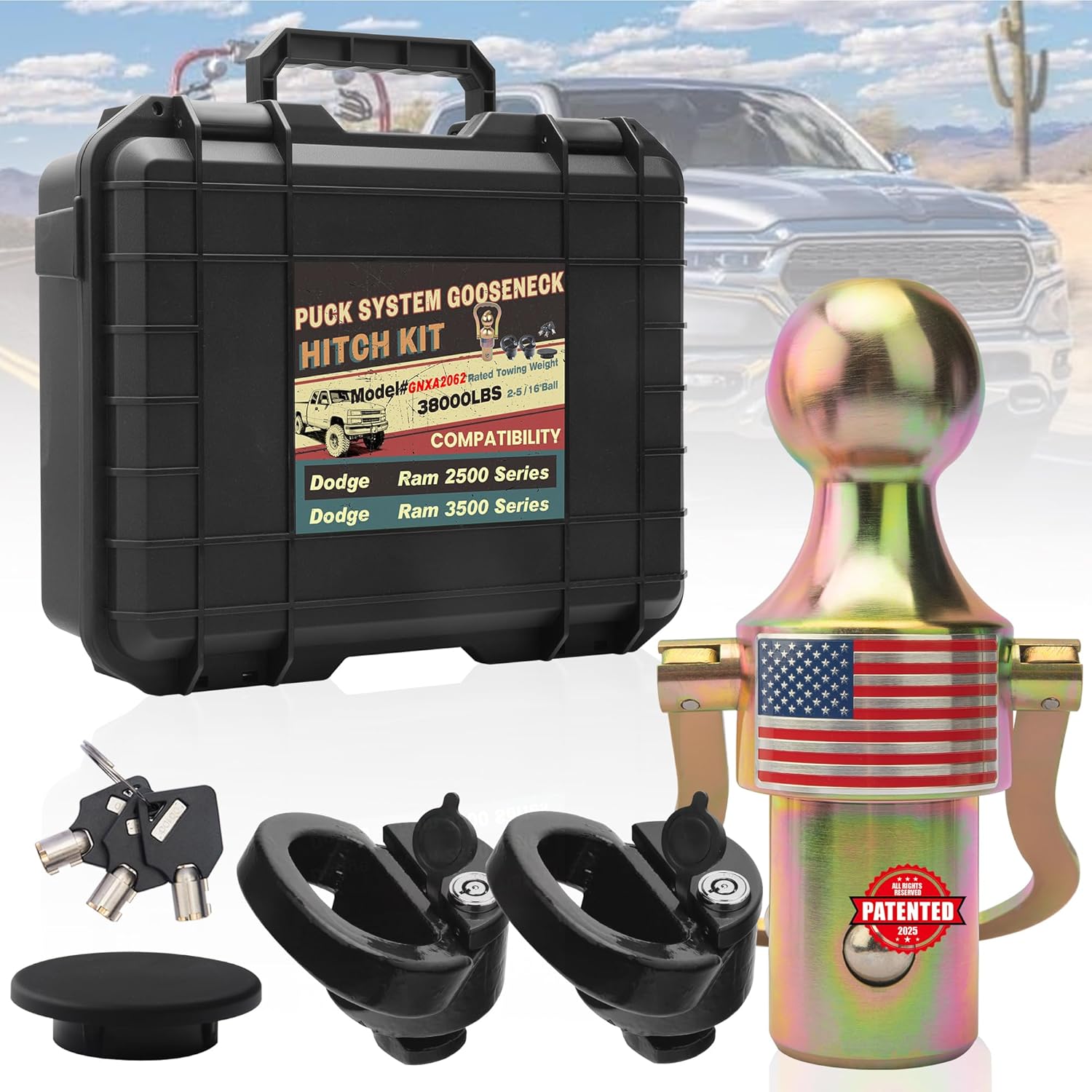 GNXA2062 Anti-Theft Locking Puck System Gooseneck Hitch Ball Kit – 38000LBS, Upgraded 3-Steel-Ball Base, 2-5/16" Ball, Safety Chain Anchors w/Anti-Theft Locks, Fit 2013-2024 Ram 2500/3500