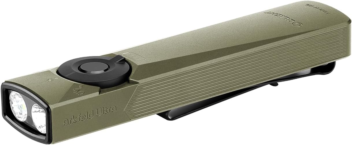 OLIGHT Arkfeld Ultra 1400 Lumens EDC Flat Flashlight, Rechargeable Compact Pocket Flash Light Combines White LED, UV and Green Beam, Triple Sources Perfect for Checking, Working (Olive-Green)