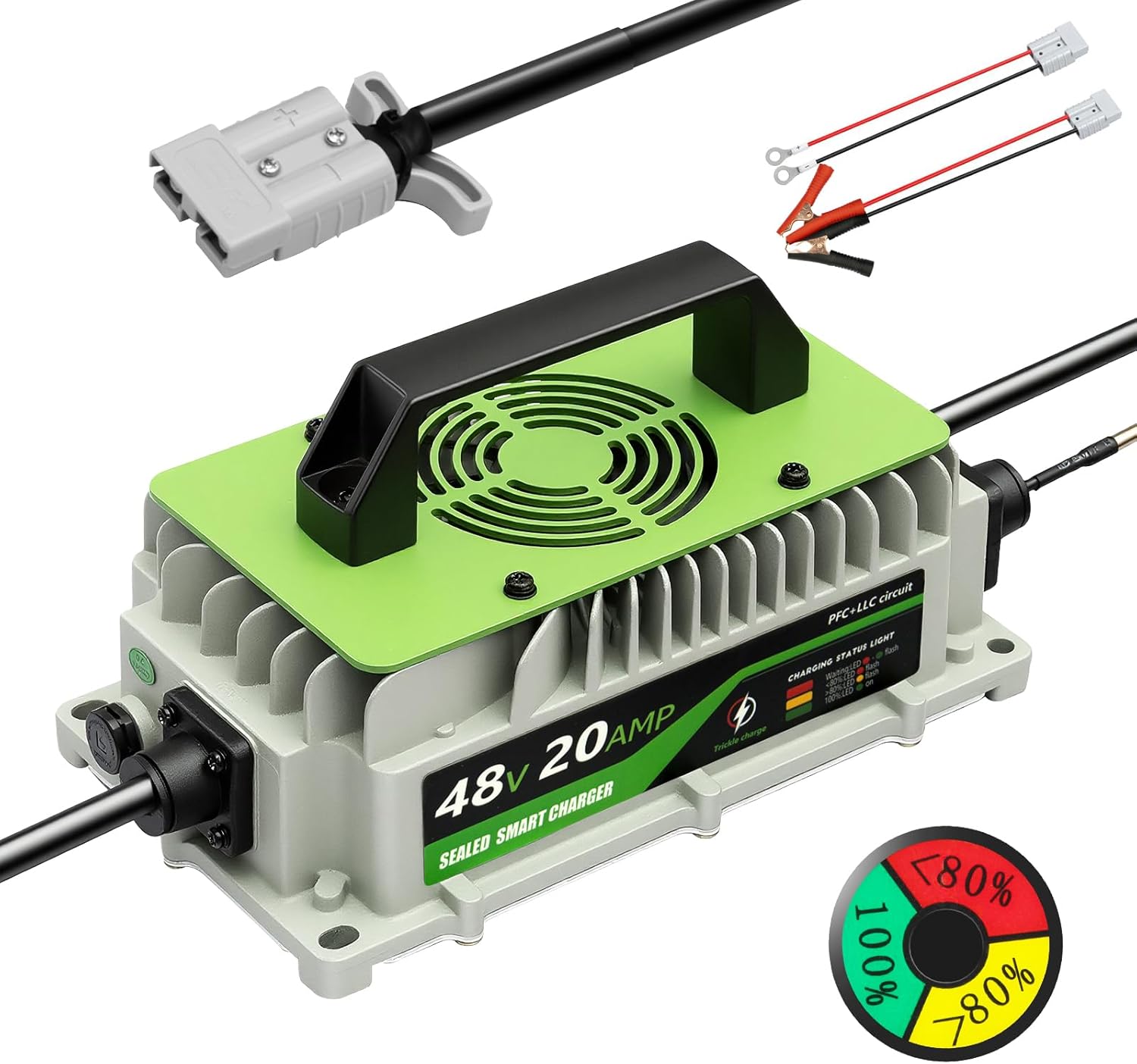 20 AMP 48 Volt Golf Cart Battery Charger 48V Lithium Battery Charger LiFePO4 Charger for Club Cars RVs Boats Cars Forklift Truck 1000W IP65 Waterproof with Cooling Fan 2 Connectors
