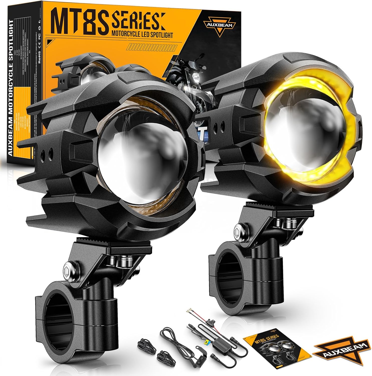 Auxbeam Motorcycle Auxiliary Lights Fog Lights LED Driving Light Spotlight with Halo DRL, White/Amber 8 Modes Dual-Color Strobe LED Offroad Work Lights for Motorcycle SUV ATV Trucks