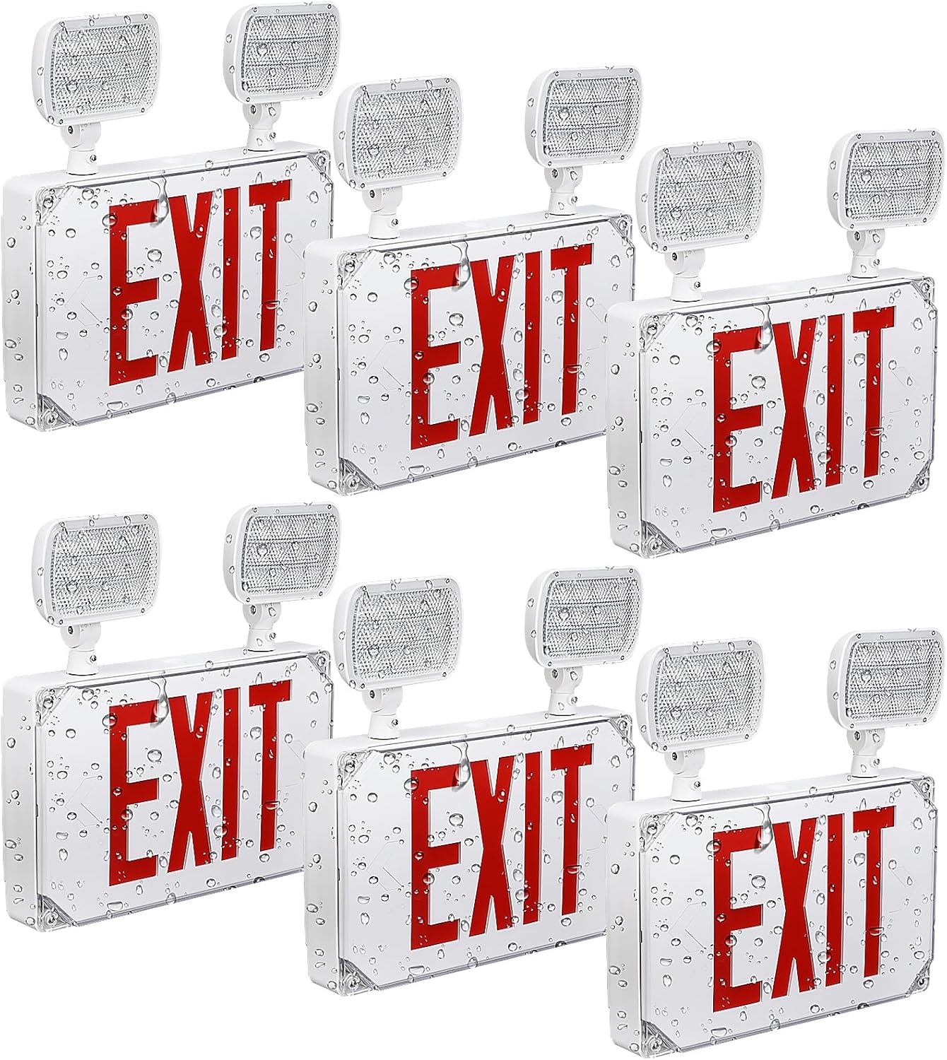 LEONLITE LED Exit Light, Wet Location Exit Sign with Emergency Lights, UL Listed, Outdoor Hardwired Red Letter Exit Sign with Battery Backup, 2 Dual Heads, Double Face, AC 120/277V, White, Pack of 6
