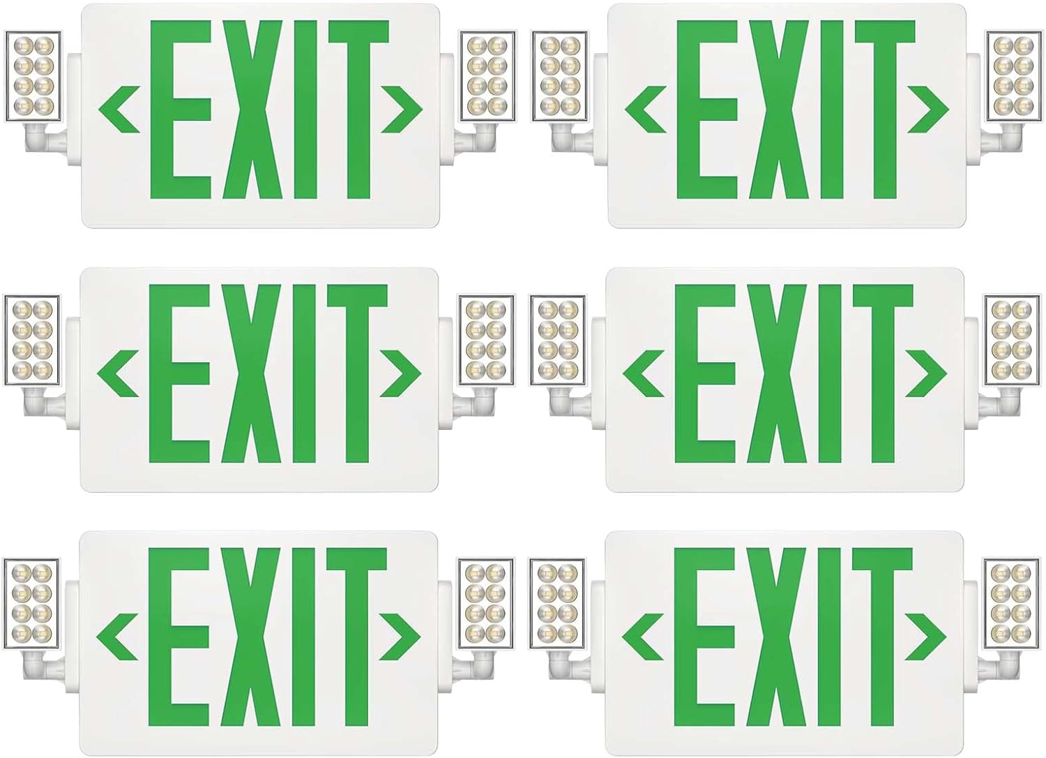 Spectsun 6 Packs Exit Signs with Emergency Lights,120-277VAC -LED Combo Emergency Light with Backup Battery-Double Face UL Listed Green Letter Exit Sign Lighting-Hard Wired-Fire Resistant