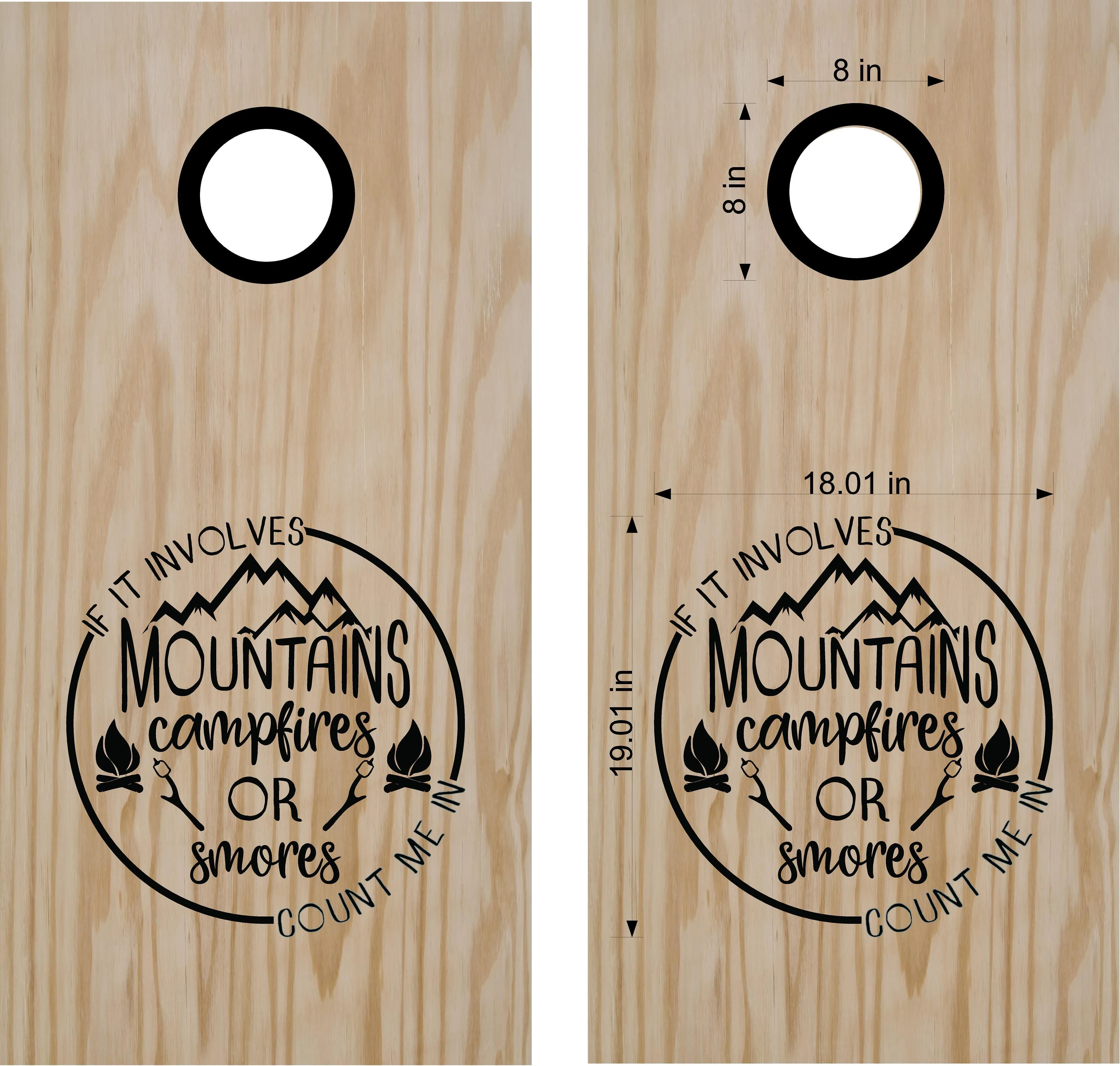 Mountain Adventure Vinyl Decal Sticker - Campfires Smores Cornhole Board Design