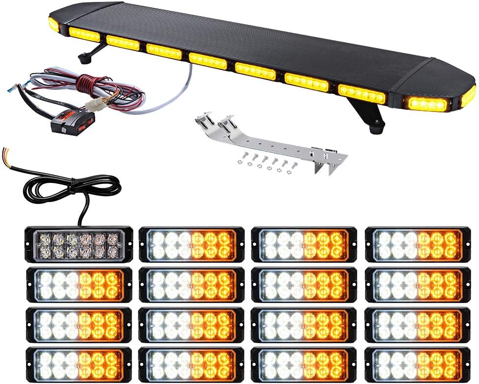 51 inch (mber 96 LED Emergency Beacon Strobe Light Bar + 16X Ultra Slim 10-LED Flashing + 16pcs 2-LED Grille Flash Lamps with Clips Pattern Switch Control Box Kit Recovery Car Tow Truck Response Plow