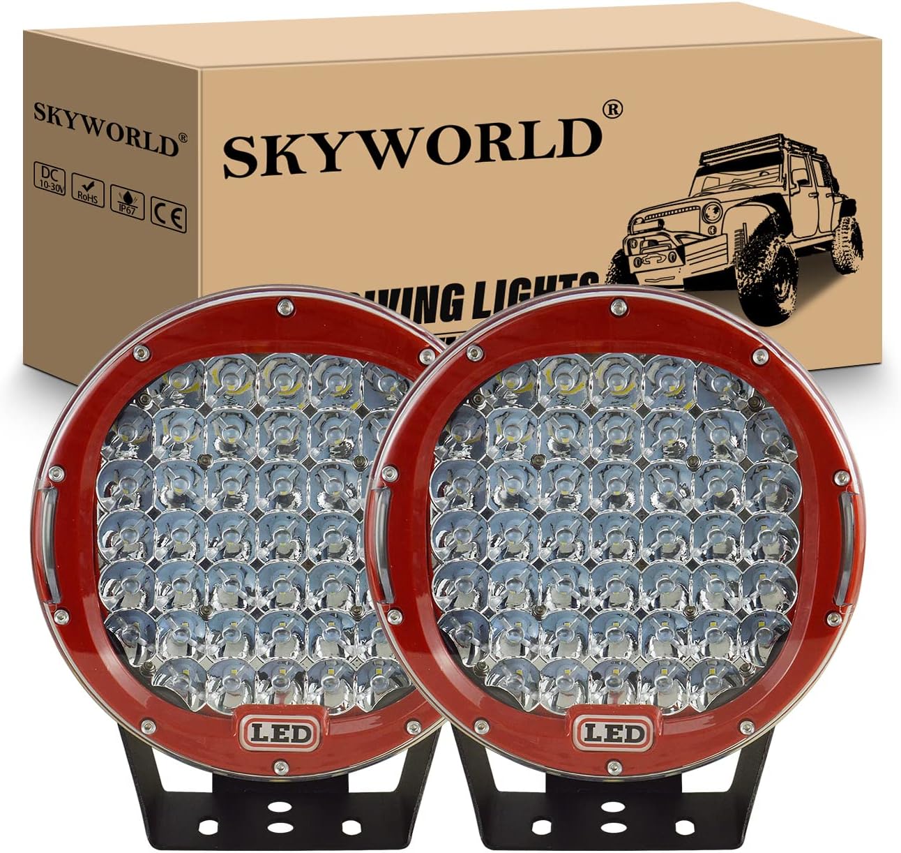 SKYWORLD 2pcs Round LED Pods Light Bar, 9 inch 225W Spot Beam Work Off Road Driving Lights Lamp Headlight Waterproof for Car Truck SUV ATV Tractor Boat, 6000K White Red Case