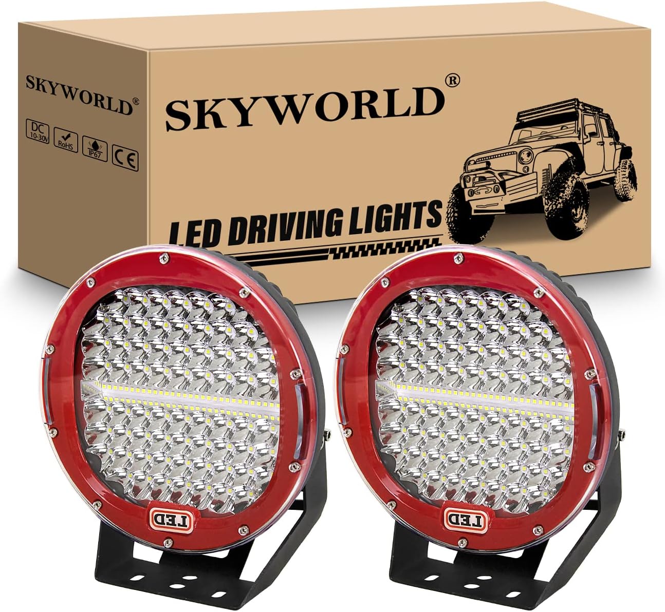 SKYWORLD 2pcs Round LED Pods Light Bar, 9 inch 294W Spot Beam Work Off Road Driving Lights Lamp Headlight Waterproof for Car Truck SUV ATV Tractor Boat, 6000K White Red Case