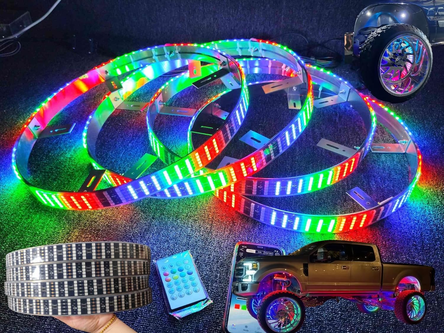 8Rolls 17.5" Double Sided Quad Row Wheel Lights - Brightest RGB Multi-Color Addressable LEDs, Dynamic Lighted Up Wheel Rim Tire Rings, Bluetooth Remote, Wheel Lights for Truck & Car