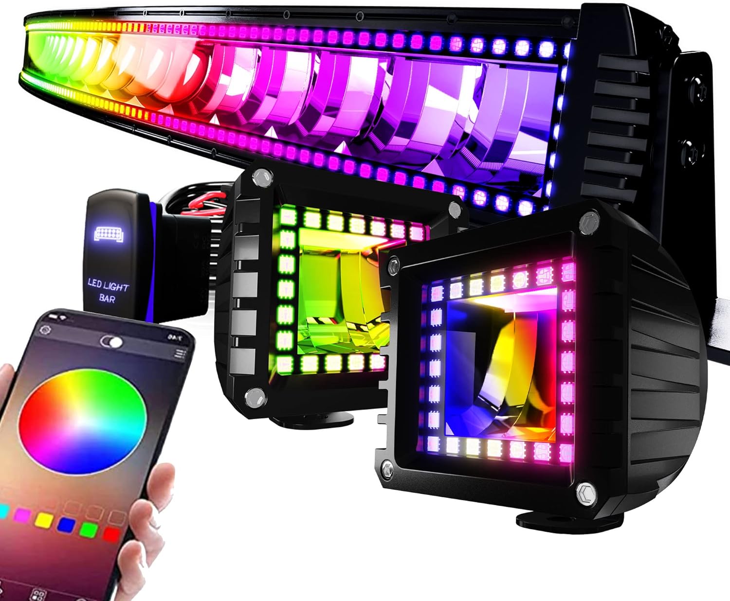 52" Curved RGB LED Light Bar 2X 4 Flood LED Pods with Chasing RGB Halo 16 Solid Colors Offroad Driving Fog Lights with Switch Wiring Harness