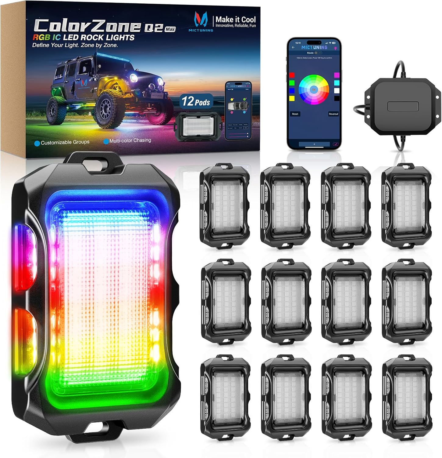 MICTUNING Q2 MAX RGB+IC Rock Lights - 12 Pods Multi-Color Zone Chasing Ultra-Bright Underglow Neon Kit, Individual Group Programming, APP Music Sync & DIY Effects, IP68 Waterproof