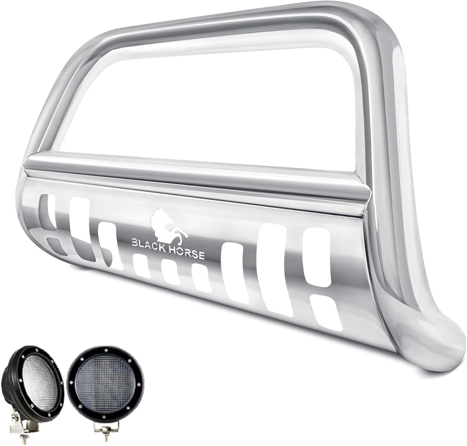 Black Horse Bull Bar Incl. Pair of 5.3" Dia.LED Lights w/Black Trim Rings Skid Plate Stainless Steel Compatible with 2015-2022 Chevrolet Colorado (Excludes ZR2)|2015-2022 GMC Canyon-BB030709-SP-PLFB