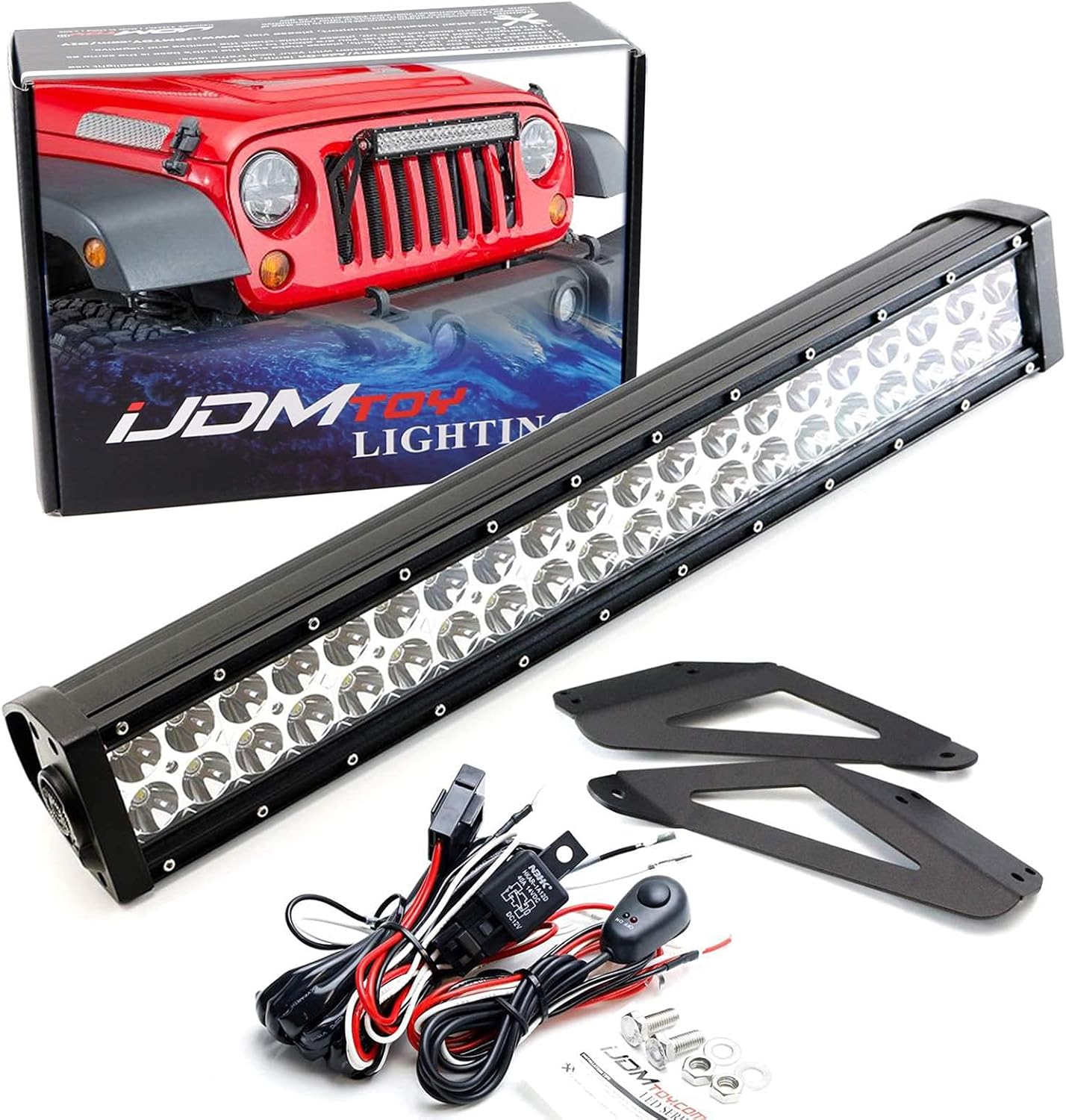 iJDMTOY Front Grille 20-Inch LED Light Bar Kit Compatible with Jeep 2007-17 Wrangler, Includes (1) 120W High Power LED Lightbar, Grill Front Mounting Brackets & On/Off Switch Wiring Kit
