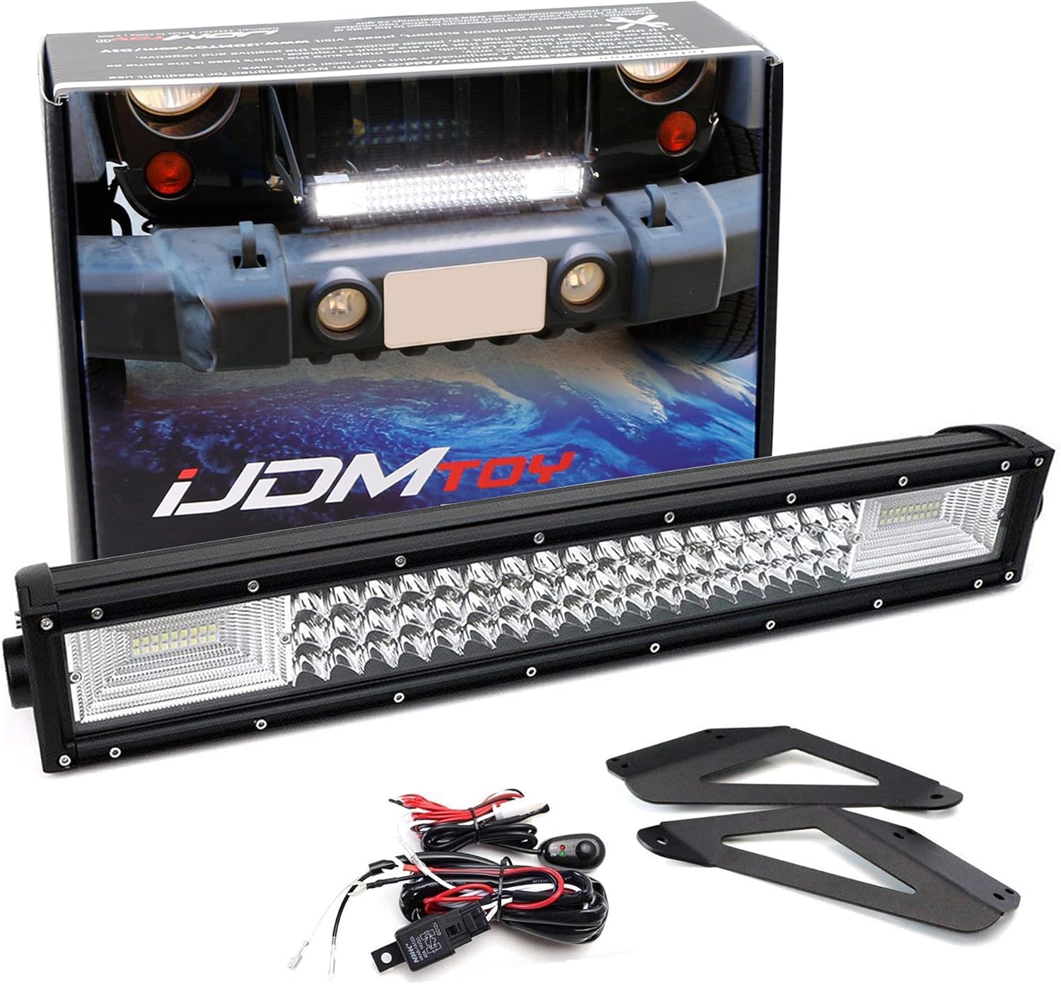 iJDMTOY Front Grille Mount 21-Inch LED Light Bar Kit Compatible with Jeep 2007-17 Wrangler JK, Includes (1) Triple-Row High Power LED Lightbar, Grill Front Mounting Brackets & On/Off Switch Wiring