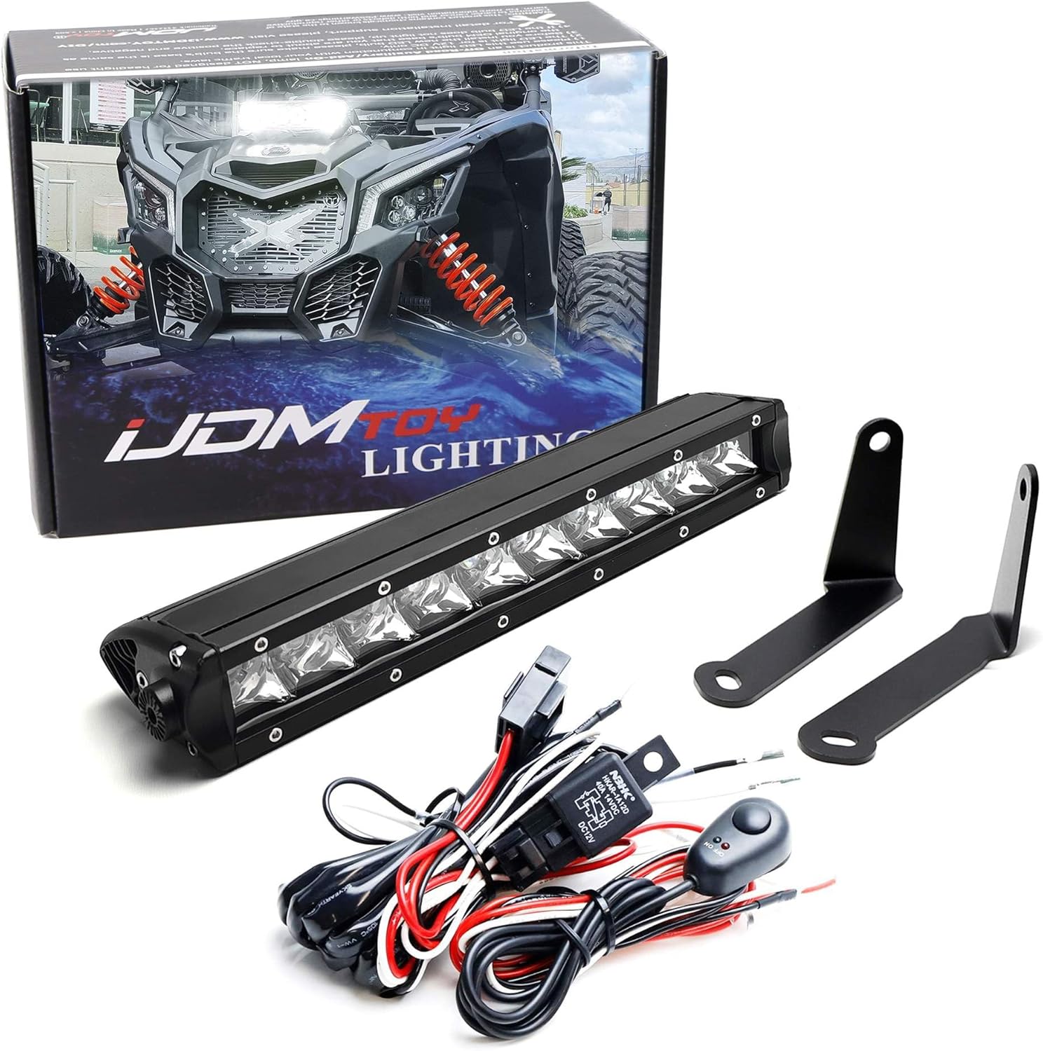 iJDMTOY Shock Tower Mount 50W LED Light Bar Kit Compatible with CAN-AM Maverick X3, Includes 50W Single Row High Power LED Lightbar, Mounting Brackets, Relay Wiring w/On/Off Switch