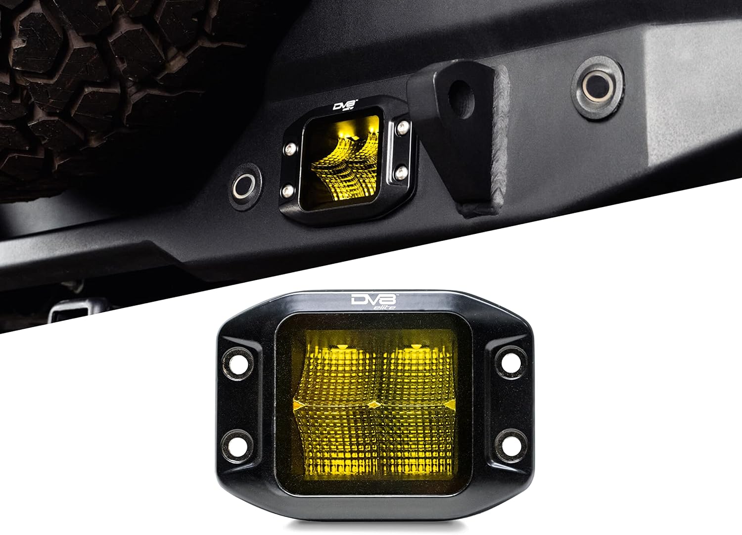 3-inch Elite Series LED Amber Flush Mount Off-Road Light Pod | Flood Light Pattern | OD Face Plate Size: 4.8” x 3.5” x 2.75” | Bezel-Less Housing with Heat Fins | DV8 Offroad