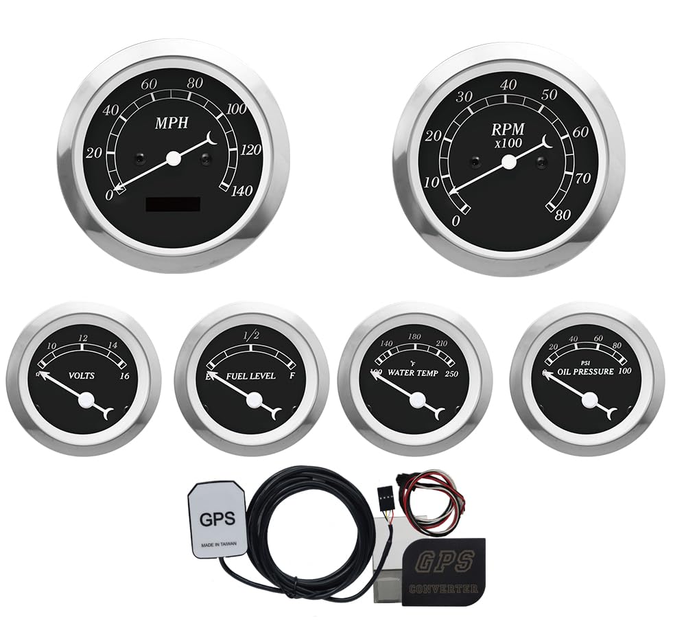 MOTOR METER RACING Classic 6 Gauge Set with GPS Electrical Speedometer Digital Odometer Black Dial White Needle Light Bulb Illumination 85mm 3-3/8" & 52mm 2-1/16"