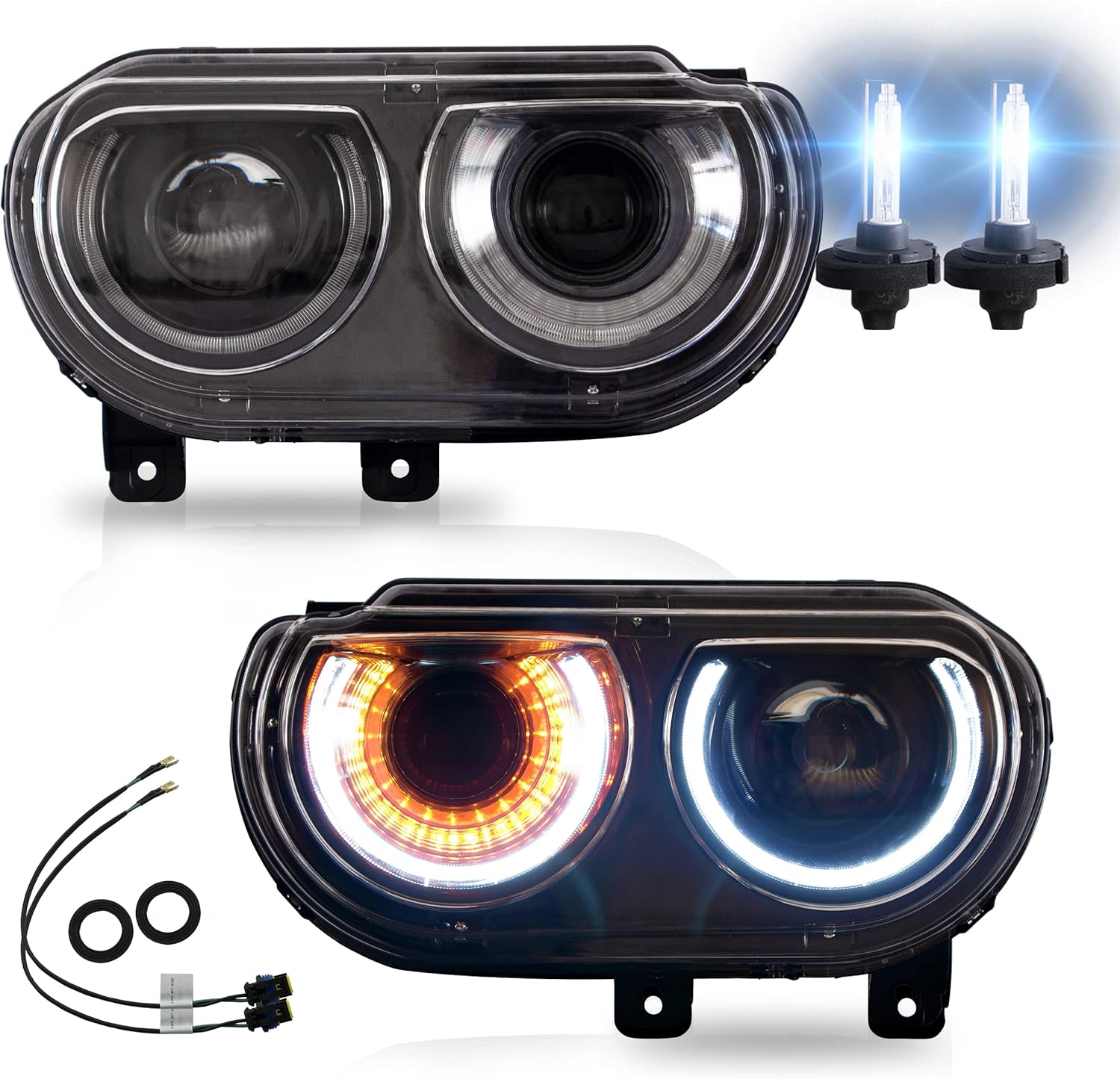 VLAND Headlights W/ D2H Bulbs Assembly Fit for Dodge Challenger 2008-2014 3rd Gen Coupe W/Dual Beam Lens DRL, LED Front light with Sequential Indicator Halo, Plug-n-Play Headlamp