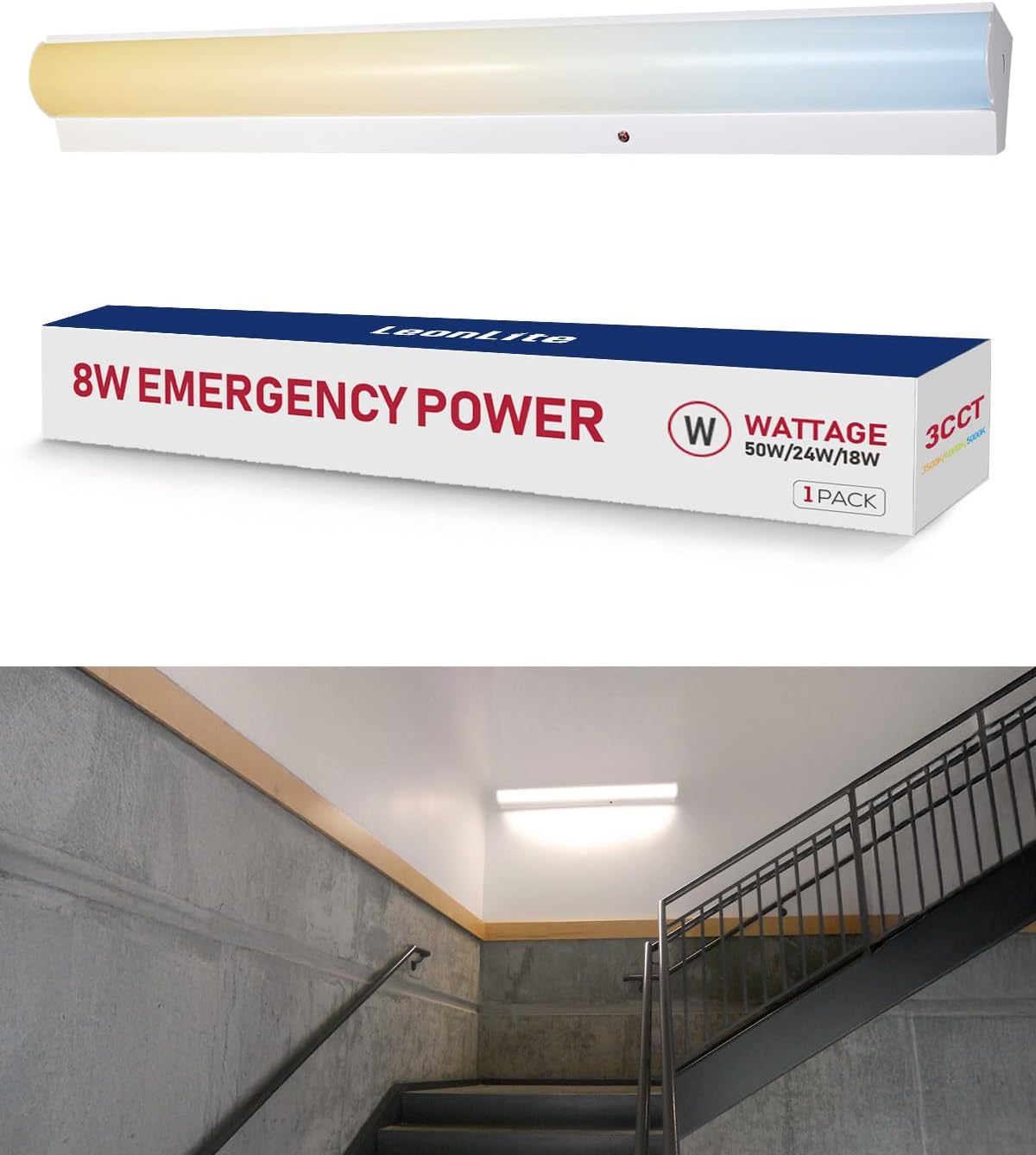 LEONLITE 3CCT 4FT LED Linear Stairwell Strip Light Fixture with Emergency Battery Backup, 90 Minutes, UL1598, 30W/40W/50W Selectable, 120V-277V, 0-10V Dimmable, Commercial LED Shop Light
