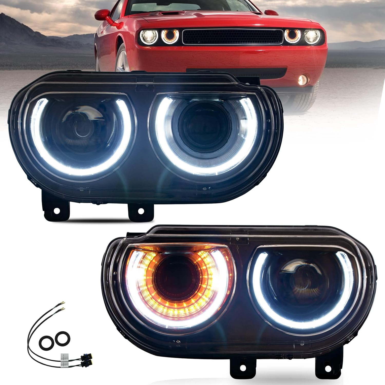 VLAND Headlights Assembly Fit for 2008-2014 Dodge Challenger 3rd Gen Coupe, Front light with Sequential Indicator Halo, W/Dual Beam Lens DRL, Plug-n-Play Headlamp