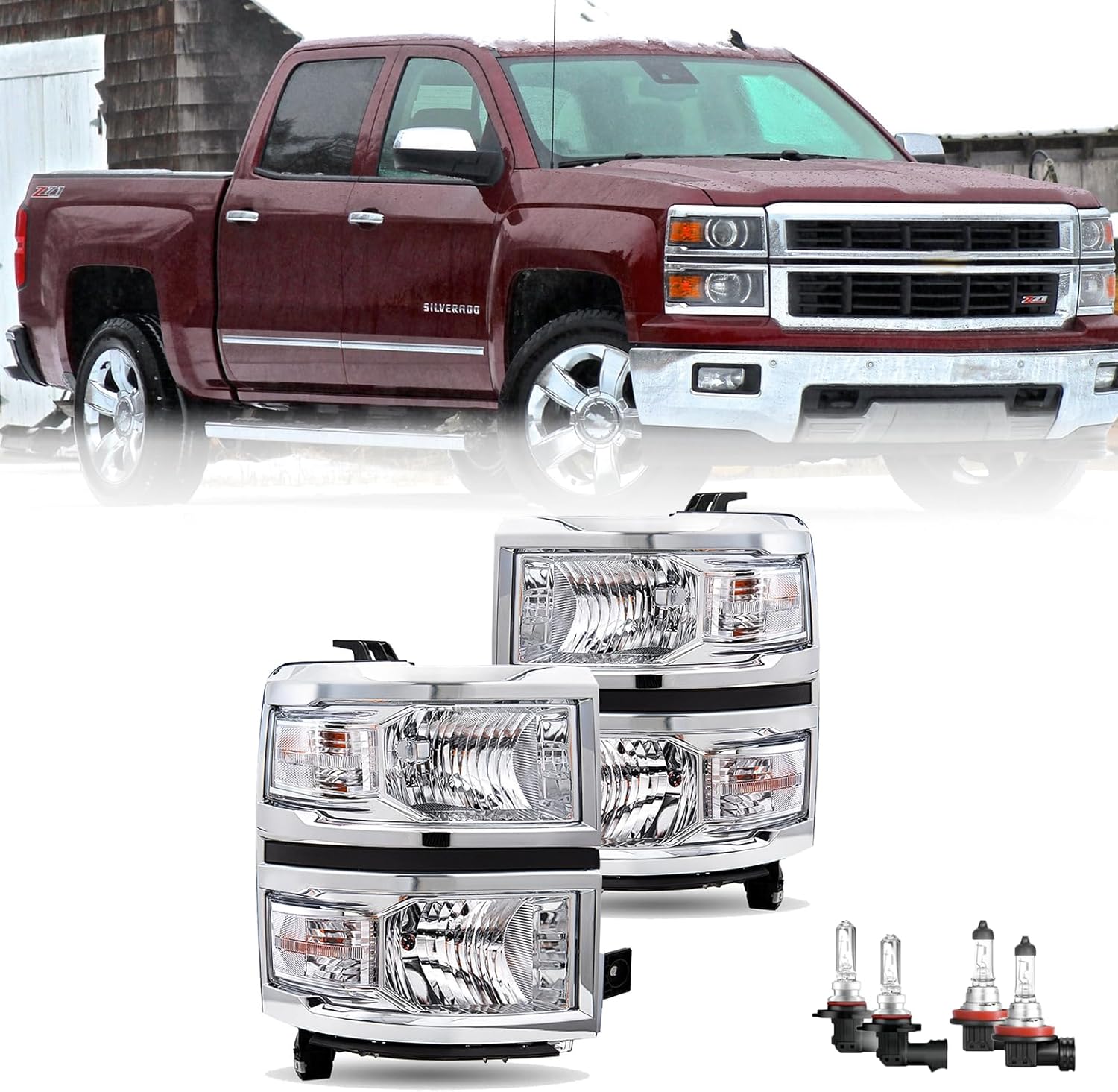 Headlight Assembly W/Bulbs Compatible with 2014-2015 Chevy Silverado 1500 Headlights Headlamps Left+Right 14-15 Lights (CHROME FRAME+CHROME INNER+WHITE SIDE)