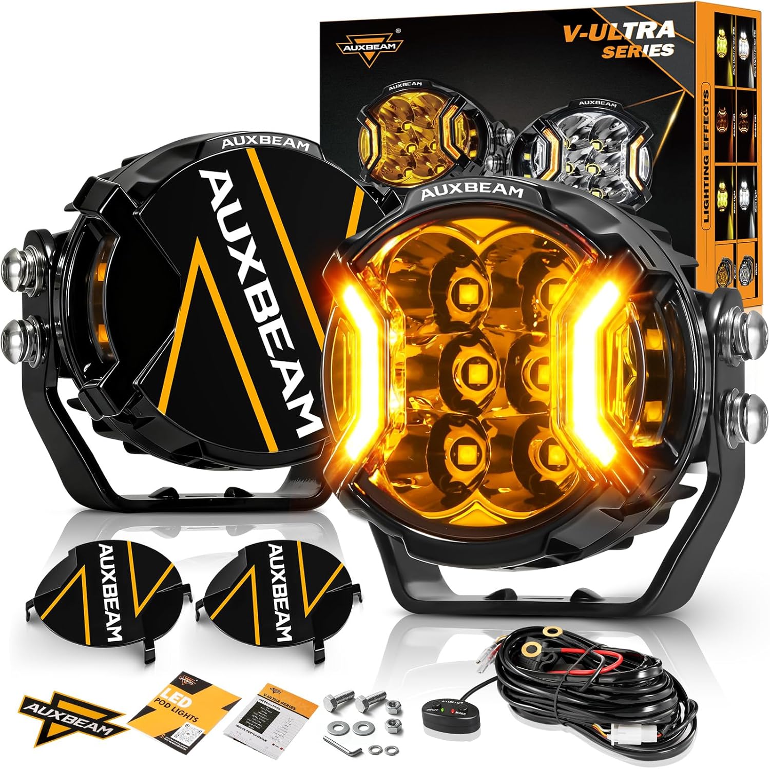 Auxbeam V-Ultra Series 3 Inch 108W LED Round Pods, 3 Modes Offroad Driving Side Shooter Light with Amber DRL, 270° Ultra-Wide Amber Cube Universal Spotlights with Covers & DT Plug Wiring Harness