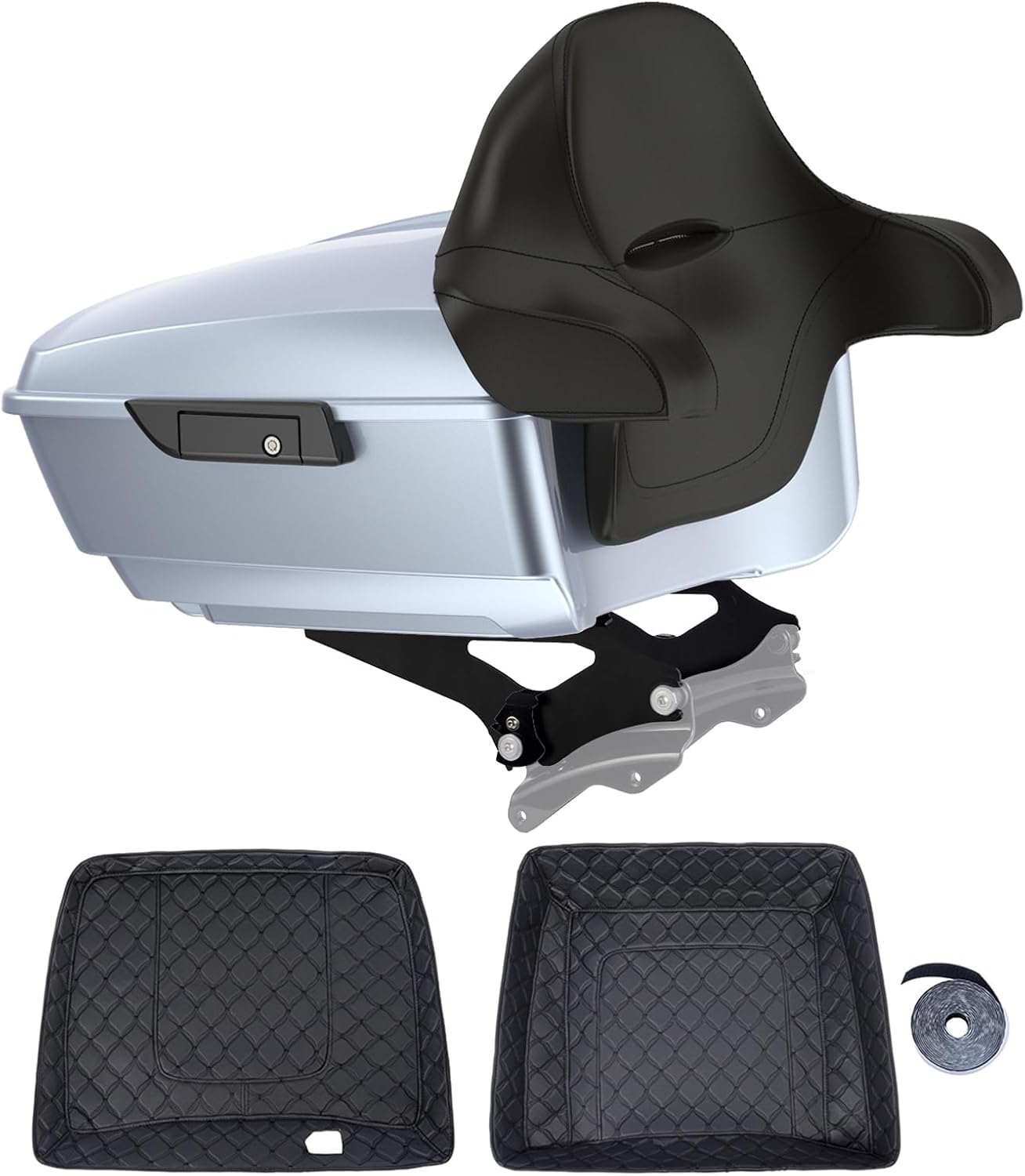 Moto Onfire King Tour Trunk Pack For 2009+ Harley Touring - Atlas Silver Metallic, Black Detachable Mounting Rack, Backrest & Black Trunk Liners