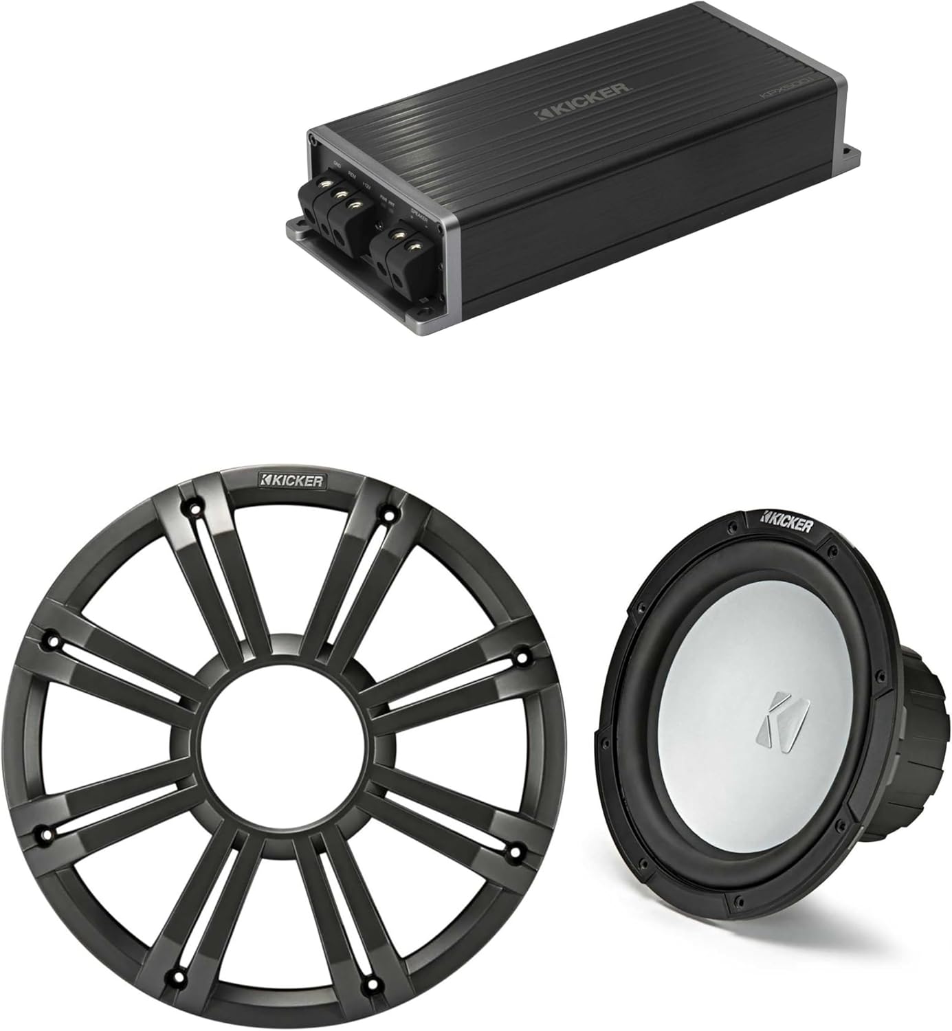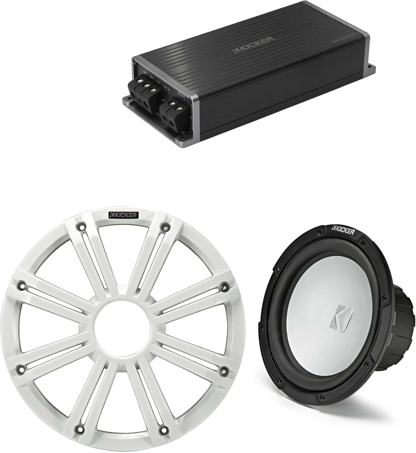 KICKER Marine KPX500.1 Powersports Amp & 10" Free Air 4 Ohm (White Grill) Subwoofer Audio Upgrade