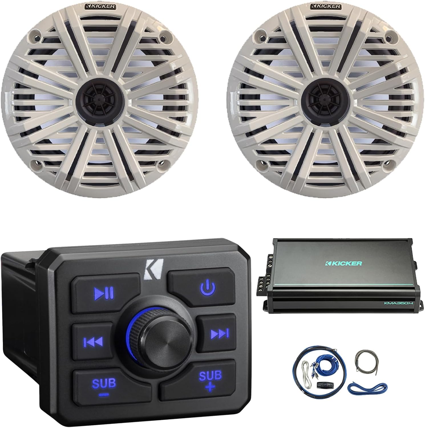 KICKER 51KBTR Marine Bluetooth Powersport USB/AUX Sub RCA Outputs Receiver, 2X 6.5 195W Max Power 4 Ohm Coaxial Speakers W/Grille, 4-Channel Weather-Resistant Full-Range Amplifier W/Kit